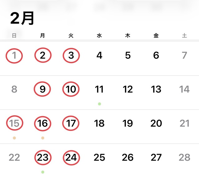 *赤丸が定休日
